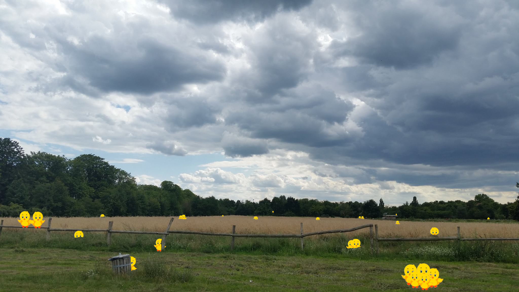Irgendwie scheint sich der Luftstrom zu verändern. War das ein Flackern? Was passiert hier? Da schon wieder… Der Ring an unserer Hand fängt an zu leuchten und plötzlich stehen wir auf einem weiten Feld und sehen aufgescheuchte Hühner kreuz und quer umherhuschen.