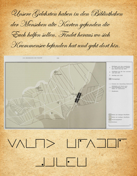 Angekommen, dort wo ehemals das kleine Mönchdorf Krummensee lag, bemerkt ihr wieder das Flackern in der Atmosphäre. Immer wieder erhascht Ihr einen Blick in die andere Welt, kurz vor der Krummen Lanke kommt das Flackern plötzlich zum Stillstand. Ein Blick auf den hell leuchtenden Ring verrät euch, dass ihr In Seglenztor seid.