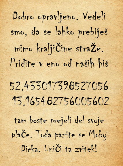 Gedacht, getan. Ihr benutzt den Zauberspruch und seht dabei im Wasser, wie ein helles Licht immer näher zu kommen scheint. Mit einem “Platsch” und einem “Klong” landet eine dreckige alte Flasche in euren Boot. Eine Flasche? Beim näheren Betrachten seht ihr, dass diese Flasche eine merkwürdig schwarze Schriftrolle enthält. Ihr fummelt die Schriftrolle aus seiner dreckigen Hülle und rollt sie auseinander…