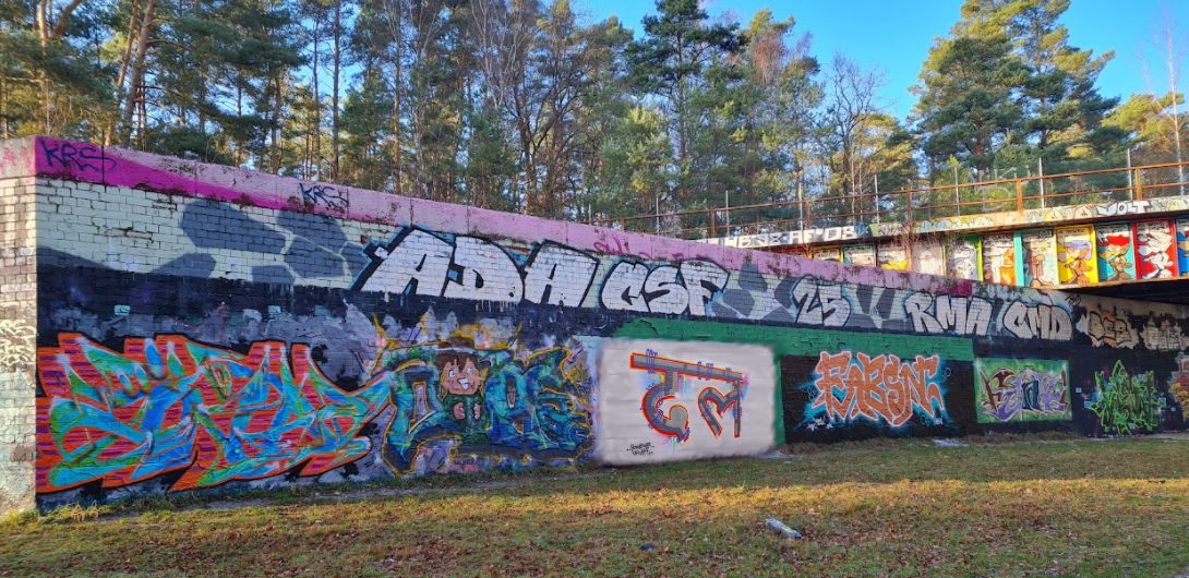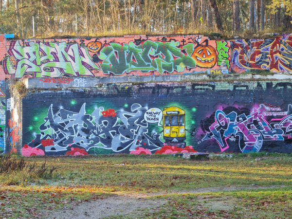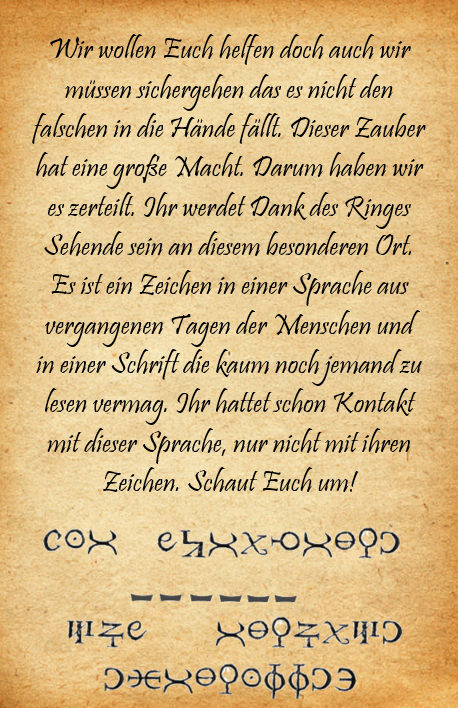 Nachdem ihr gestern doch einen sehr aufregenden und anstrengenden Tag hattet, konntet ihr letzte Nacht kaum ein Auge zu machen. Euer Ring leuchtet noch immer hell auf. Ihr hofft, dass es noch nicht zu spät ist, den Kristall wieder zu holen. Da ihr eh nicht mehr schlafen könnt, beschließt ihr, schon in der Dämmerung euren Weg fort zu setzen. Die Route führt euch nach Westen bis zu einer breiten Schneise. Hier muss es früher mal etwas gegeben haben. Ihr schaut auf euren Kompass. Die Nadel schlägt stark nach Norden aus. Wie gut, dass ihr den Kompass gefunden habt. Im Leben hättet ihr ohne ihn nicht diesen Weg eingeschlagen. Der Kompass führt euch weiter immer entlang dieser breiten Schneise, bis ihr in einiger Entfernung einen großen Brückenbau erkennen könnt. Dort, besagte euch die Schriftrolle, findet ihr den nächsten Hinweis. Etwas an dieser Brücke ist anders. Ein Blick auf den Baum verrät euch, dass ihr in eurer Welt seid. Ihr schaut sie euch an und bewundert die viele Graffitikunst, doch eine hat es euch angetan. Es ist, als wenn dieses Zeichen etwas Magisches an sich hätte. Was ist das? Ein Wort? Und was bedeutet das? Was ist das da auf dem Boden? Eine leere Flasche, aber da ist doch was drin. Ihr nehmt sie in die Hand und seht, dass da ein kleiner zusammengerollter Zettel drin steckt, den ihr vorsichtig rausholt und entfaltet. Es scheint der Zauberspruch zu sein, doch es fehlt ein Teil davon. Ihr schaut euch den Zettel genauer an und lest: