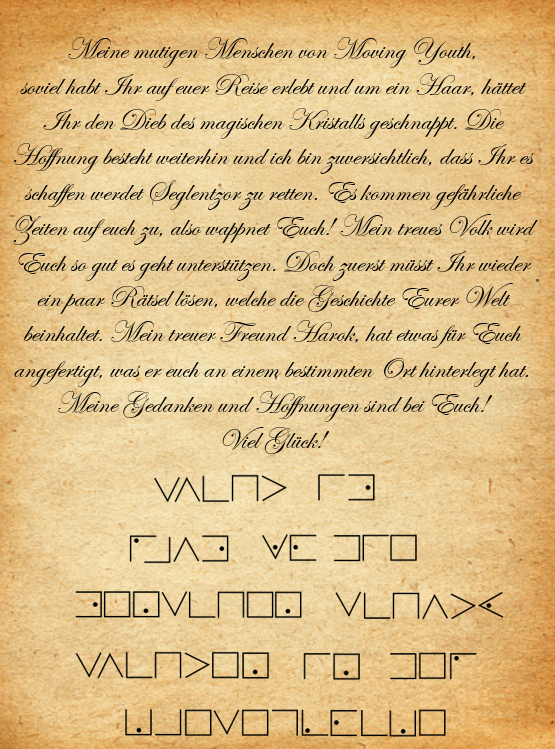 Silvia holt aus ihrem rotem Poncho eine mit dem Zeichen der Königin versiegelte Schriftrolle hervor und reicht sie euch. Mit einem kurzen Knack, brecht ihr das Siegel auf, entrollt diese, auf der, in der geschwungenen Schrift der Königin geschrieben steht: