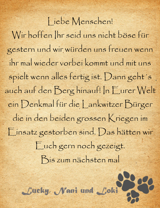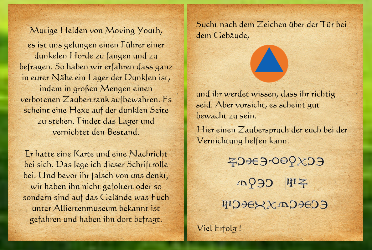 Das ist aber lieb von den Dreien. Ihr könnt ihnen nicht böse sein und beschließt, dass wenn es geht, ihr noch mal wieder zu kommen. Es hat doch wirklich Spaß gemacht und außerdem habt ihr ja auch noch für die anderen Attraktionen Freikarten. Das wäre doch schade, wenn die einfach so verfallen würden. Doch nun weiter mit eurer Mission. Da war doch noch eine Schriftrolle. Ein Griff in den Rucksack und ihr holt sie heraus und entrollt sie. Es ist eine Nachricht von Hauptmann Beron aus der Kadettenanstalt.