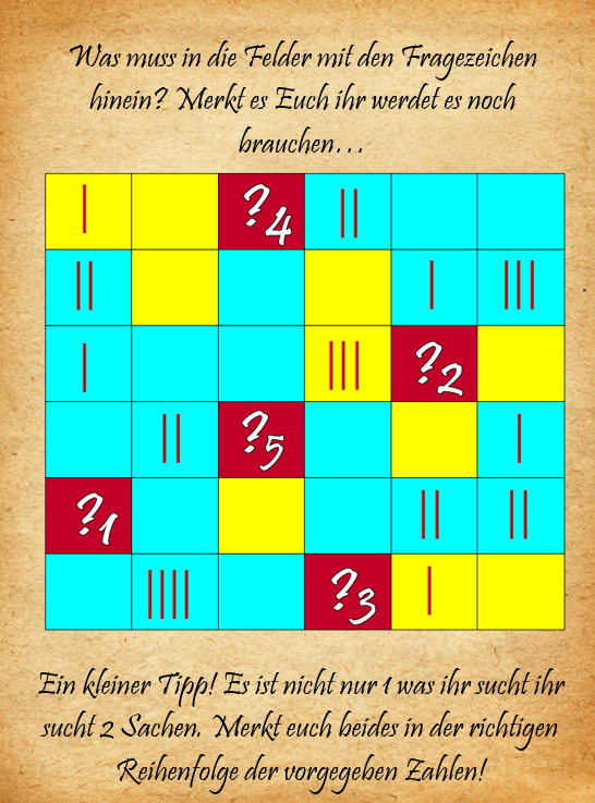 Ihr sitzt gut geschützt. Die Orks kamen kurz vorbei, um zu schauen, wer oder was ihr Lager zerstört hat, aber sie haben euch nicht entdeckt und sind wieder zurück zum Bunker. Ihr habt noch einen Happs gegessen und überlegt nun, wie es weiter geht, in dem Moment seht ihr ein bekanntes Lächeln zwischen den Büschen. Zu dem Lächeln kommt ein Gesicht zum Vorschein. Es ist die Alte Elfe von der Elfie Wiese. Verfolgt Sie euch? – Egal ihr freut euch, sie zu sehen. „Hallo ihr Menschen! Schön euch zu sehen! Und noch schöner zu sehen, ist das Chaos, was ihr verursacht habt. Vielen lieben Dank, das ihr das gemacht habt. Ihr seid eine große Hilfe für Seglentzor! Wahre Heldinnen und Helden!“ – Sie zieht eine Schriftrolle hervor und sagt: „Es ist zwar nicht unbedingt nötig, aber ich mag es so sehr, zuzuschauen wie andere Wesen Rätsel lösen, darum meine Frage ob ihr vielleicht Lust hättet, dieses besondere Rätsel zu lösen?“ Ihr habt die Elfe ins Herz geschlossen und na klar löst ihr das Rätsel. Mit wahrer Freude reicht sie euch das Pergament mit dem Rätsel…